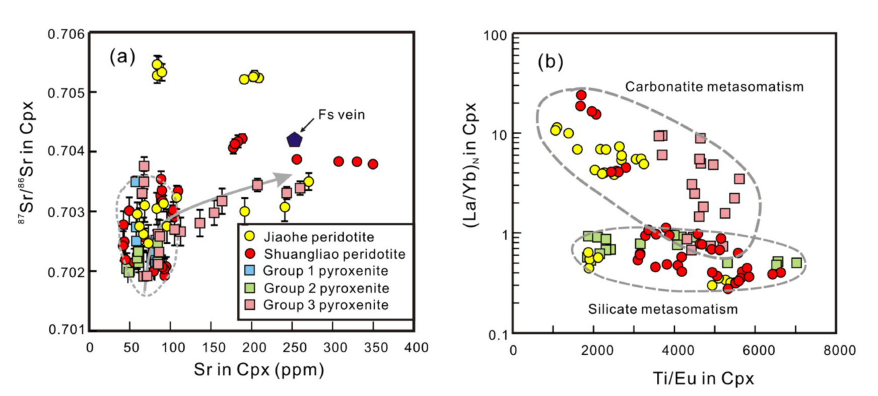 图2.(a)单斜辉石Sr同位素-Sr含量图解;(b)单斜辉石La/Yb与Ti/Eu比值