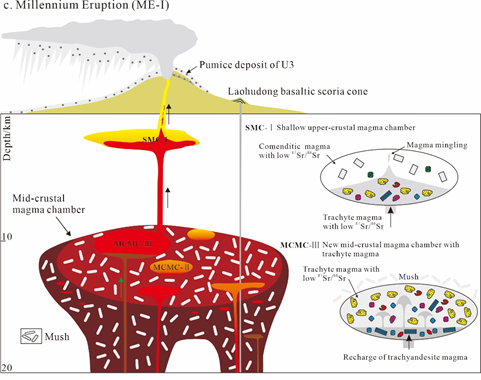 通过多次联合野外地质考察,厘定了长白山破火山口阶段火山喷发序列。即长白山破火山口阶段喷发主要由天文峰期(TWF)、千年大喷发第一期(ME-I)、千年大喷发第二期(ME-II)等三次中等-大规模普林尼式喷发构成(图1)。在野外地质研究基础上,利用包裹体温压计和矿物温压计估算岩浆驻留深度,结合地震、大地电磁成像,提出长白山破火山口阶段存在由浅部岩浆房(埋深0.5-3 km)、中地壳岩浆房(埋深10-15 km)和壳幔边界残留基性岩浆房(40 km左右)构成的复合岩浆房系统(图2)。进一步根据主微量元素和Sr-Nd同位素分析结果,区分出三条岩浆演化路径。结合岩石学、矿物学分析,认为天文峰期和千年大喷发第一期的碱流质浮岩喷发由浅部岩浆房系统控制,中地壳岩浆房起到了岩浆补给站的作用,即浅部岩浆房中碱流质岩浆均继承自中地壳岩浆房中造锥期残留的粗面质岩浆,为粗面质岩浆向碱流质岩浆演化后,上升并注入到浅部岩浆房逐渐聚集形成。而千年大喷发第二期粗面质浮岩则直接来自破火山口阶段中地壳岩浆房中新注入的粗面质岩浆。