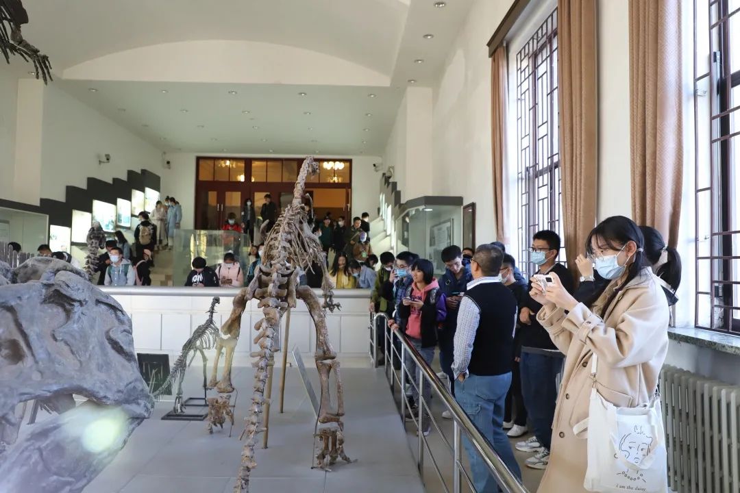 走进地质宫,映入同学们眼帘的是各种各样的岩石标本,它们静静地讲述着以百万年为跨度的地质变化,超越人类之外,遥望整个地球。馆内同时也陈放了三叶虫化石、类人猿头骨和恐龙化石等标本,激发了同学们对于古生物浓厚的兴趣。