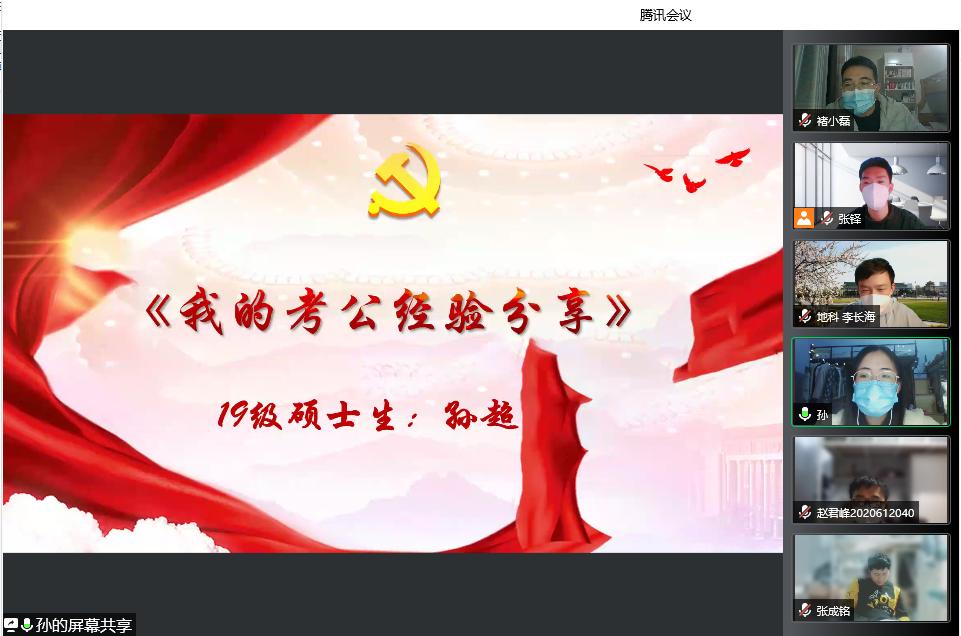 2019级硕士孙超从公务员考取的角度,以《我的考公经验分享》为题,从考公准备、笔试经验及考公建议三个方面与同学们分享了自己求职经验。他说,公务员考取过程中最重要的是合理安排复习时间,要根据各个地区的考试内容形成适合自己的做题习惯,在有限的时间中进行取舍。他鼓励同学们灵活运用网络上的信息和资源,趁早确定未来的职业发展方向,合理利用时间,提前准备,为自己创造更多的就业优势。