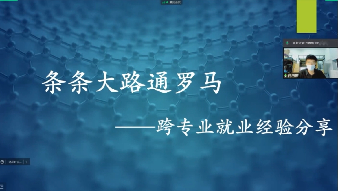 最后,2019级硕士许海博从跨专业就业的角度,以《条条大路通罗马,跨专业就业经验分享》为题,围绕就业选择、简历编写及投递、面试经验三个方面与大家分享了自己的应聘经验。他表示,就业地点与行业发展前景都是重要的考虑因素,同时个人兴趣爱好也不能被忽视。最后,他还就简历撰写经验、面试技巧等进行了分享。许海博鼓励有跨专业意向的同学提前积累实习经验,并祝愿大家在不远的未来都能寻得心仪的工作。