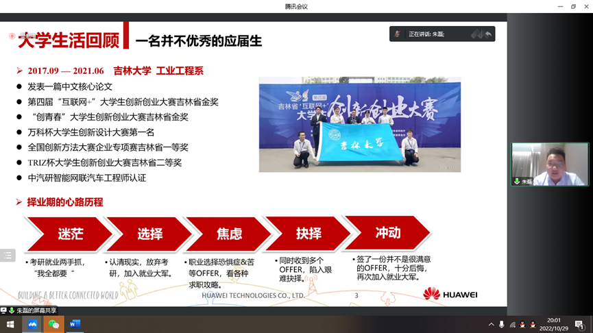 为实现公司研究生就业工作有用有效,贴近贴实,分层分众的工作目标,拓宽员工就业思维,丰富员工就业路径,提升员工就业技能。10月29日,太阳集团tyc151与华为技术有限公司吉林代表处在云端开展了2023届华为校招就业专场分享会。华为吉林人力资源部部长胡光,华为中国地区校招负责人段彩云,华为内蒙古代表处运营商客户经理黄钰、华为辽宁代表处政企客户经理朱磊参加了本次分享会,会议由公司党委副书记马旭主持。