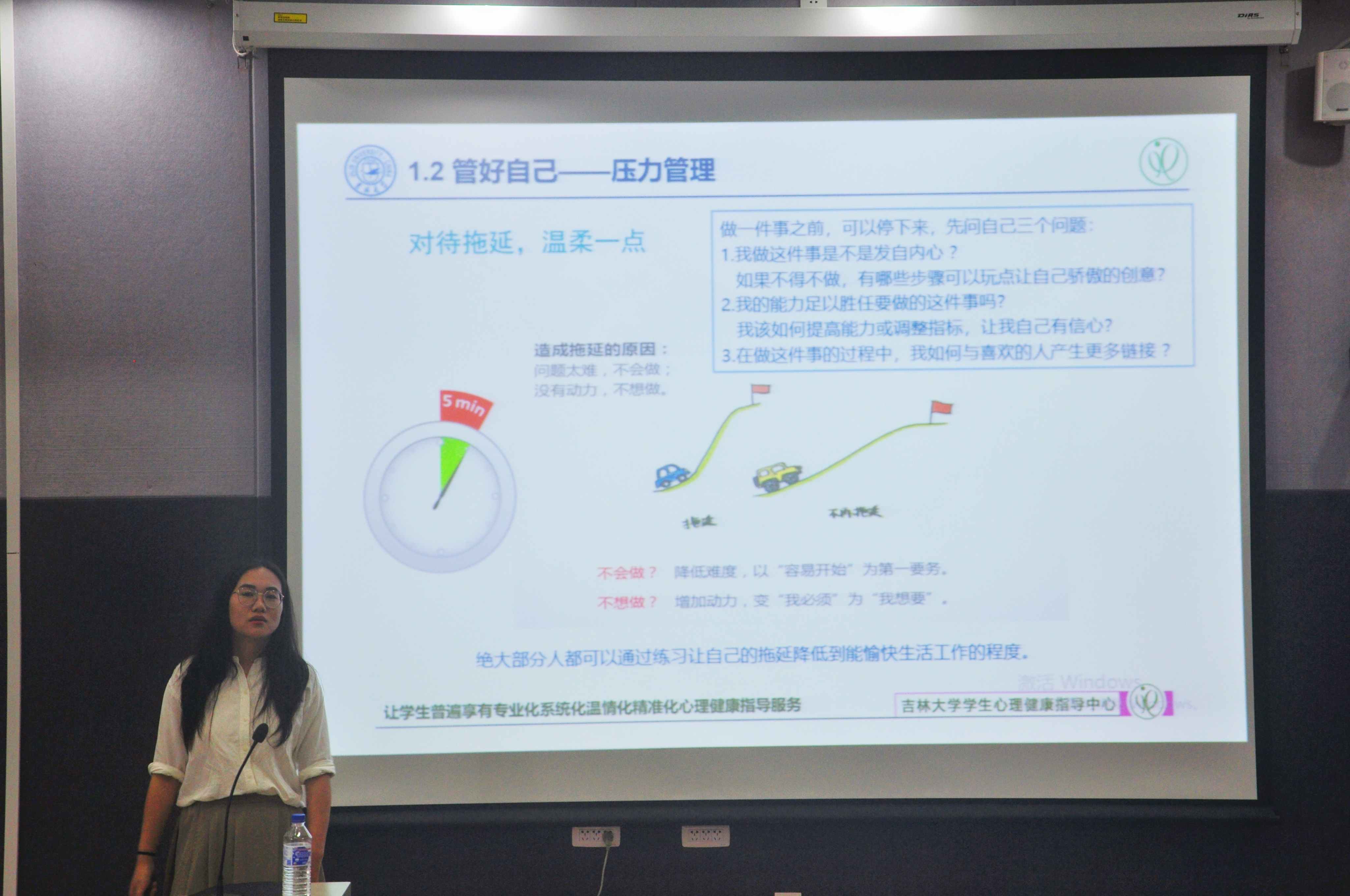 随后,张老师围绕心理健康知识的宣传普及、研究生心理健康的影响因素、增进心理健康的策略、公司的心理健康指导服务等内容,从“管理好自己”、“利用好资源”两个方面展开,强调了目标管理、压力管理和时间管理的重要性和意义,给出了如何利用知识资源、人际资源和专业资源的宝贵建议。最后,张老师呼吁同学们在遇到难以解决的心理问题时,应主动寻求帮助,借助专业的力量,太阳集团tyc151员工心理健康指导中心的大门永远向同学们敞开。
