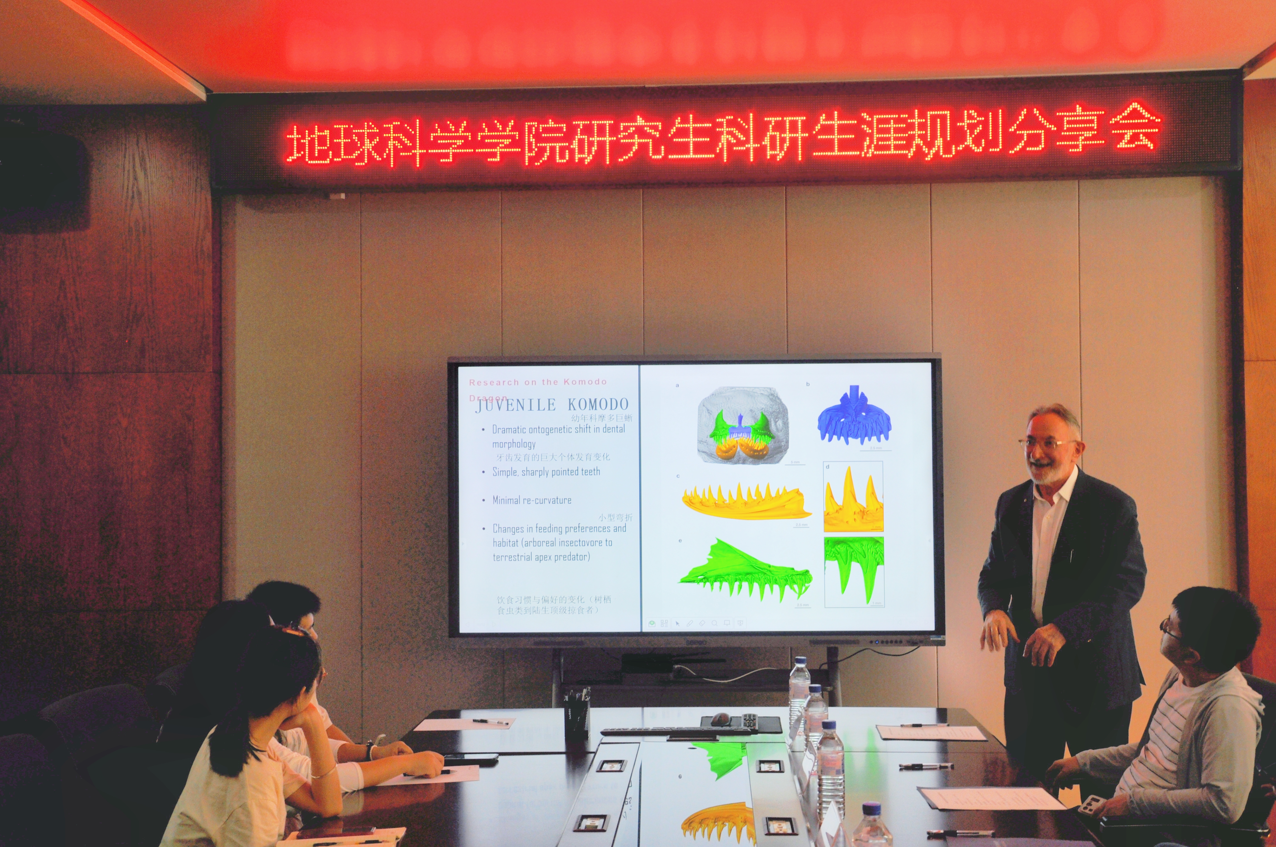 随后,参会师生与赖兹院士针对地球环境变迁与生物结构演化之间的关系、史前动物的演化与古生态模式等问题进行了深入交流探讨。同时,赖兹院士以声情并茂的讲述和幽默风趣的语言,向同学们分享了自己科研生涯上的宝贵经验和深刻启示,勉励同学们尽早确立明确的科研目标、找到合适的科研方法、保持强烈的科研兴趣,在科学研究的道路上一往无前、屡创新高。