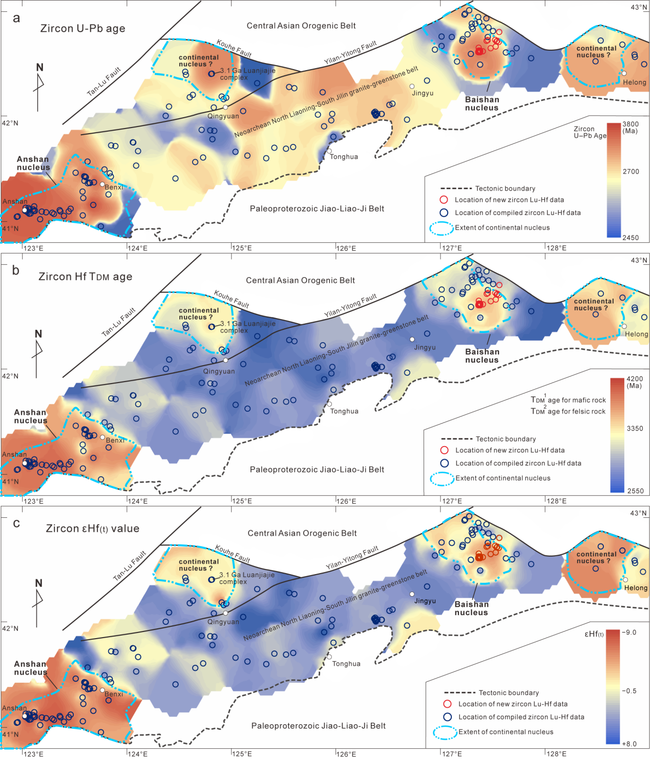 图3 华北克拉通鞍山–吉南地区太古宙地壳结构特征;(a)锆石U–Pb年龄等值线图;(b)锆石Hf模式年龄等值线图;(c)锆石εHf(t)值等值线图