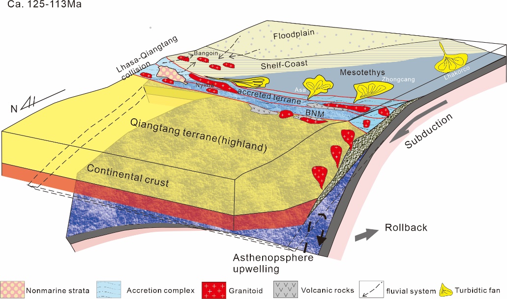 研究结果显示:1)狮泉河-纳木错蛇绿混杂岩带中阿索、中仓和拉果错地区均存在深海浊积岩(图1),这些浊积岩的沉积时代均为早白垩世Aptian期;2)该期浊积岩既存在有北侧羌塘地体提供沉积物的浊积岩,也存在沉积物主要来源于南侧拉萨地体的浊积岩;3)狮泉河-纳木错蛇绿混杂岩带所代表的洋盆在早白垩世Aptian期仍然存在,且阻断了大洋南侧的拉萨地体和羌塘地体的沉积物交换(图2)。
