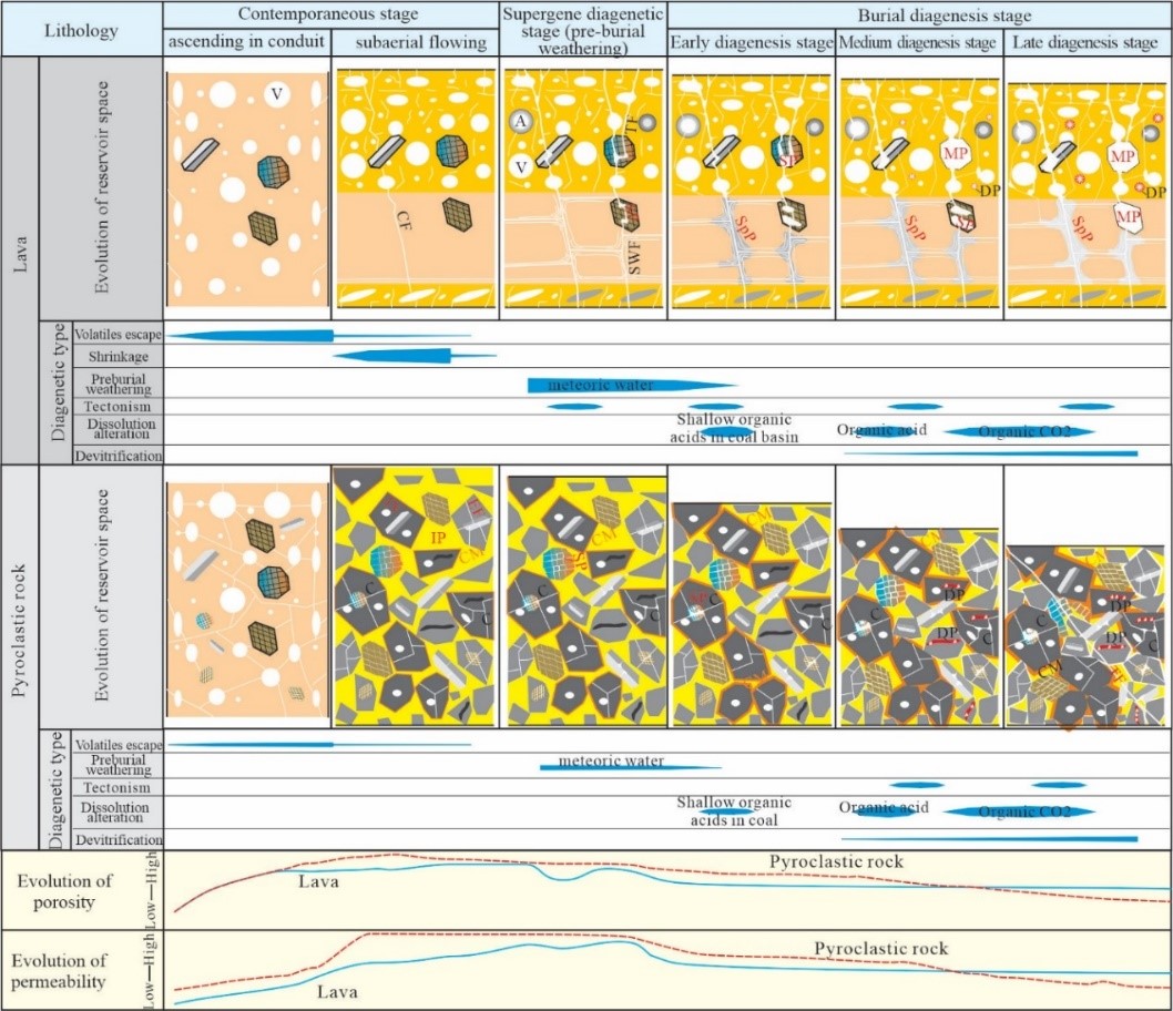 火山岩储层的形成是上述多因素的综合结果,大体上可以划分为同喷发期原生孔隙形成阶段,埋藏前风化阶段、埋藏溶蚀阶段。伴随热液充填(同喷发期火山热液和后期构造-热事件热液)的改造,有的区域还经受埋藏后抬升剥蚀、再埋藏的过程,使储集空间的演化过程更加复杂化。先形成的原生孔隙、裂缝和构造裂缝为后期流体作用于岩石提供通道,控制着次生孔隙的发育。