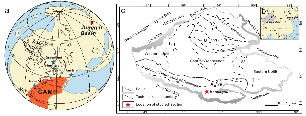 三叠纪末海洋生态系统发生了举世瞩目的生物灭绝事件,与之相关的三叠纪-侏罗纪之交的古气候变化研究是揭示生物灭绝起因的关键。晚三叠世中大西洋岩浆区(Central Atlantic Magmatic Province)强烈的岩浆活动导致全球气候大扰动是其重要假说之一,前人研究多聚焦于距大西洋火成岩省较近的低纬度古特提斯洋边缘地区三叠系-侏罗系界线。这种变化在高纬度大陆地区是否存在?这一关键问题一直没有得到很好回答,从而制约了对三叠纪-侏罗纪之交古气候变化的全球性认识。