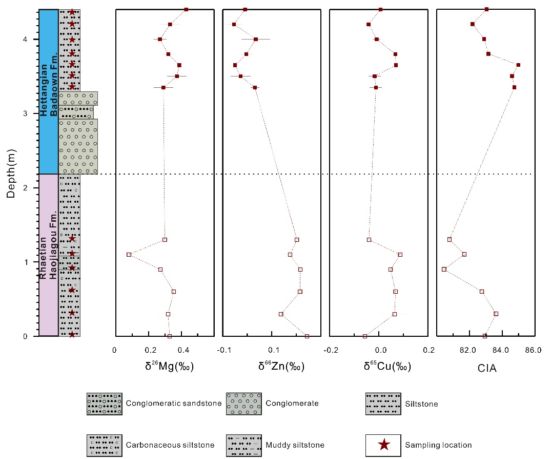 针对上述科学问题,太阳集团tyc151许文良教授团队的博士研究生邢恺晨和王枫教授(通讯作者)等人,联合美国华盛顿大学非传统实验室Fang-Zhen Teng教授和中国地质大学(武汉)地质过程与矿产资源国家重点实验室李明高级工程师,对早中生代期间位于高纬度地区的新疆准噶尔盆地南缘的一套连续沉积的三叠系—侏罗系陆相剖面(郝家沟组-八道湾组,图1)进行了全岩主微量元素和Mg-Cu-Zn同位素系统研究(图2),得到如下认识: