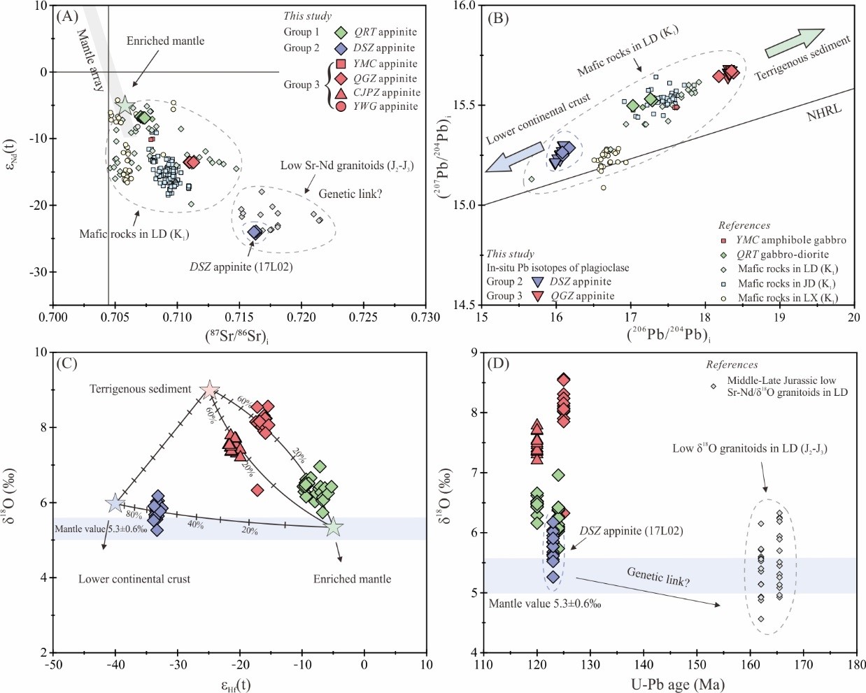 针对上述科学问题,太阳集团tyc151许文良教授团队的博士研究生闫相宇和杨德彬教授(通讯作者)等人,对华北克拉通东部辽东半岛地区早白垩世六个富闪侵入岩体(图1)进行了锆石U-Pb年代学,全岩主微量元素及全岩Sr-Nd-Pb同位素,并结合锆石Hf-O同位素及原位斜长石Pb同位素的系统研究(图2),得到如下认识: