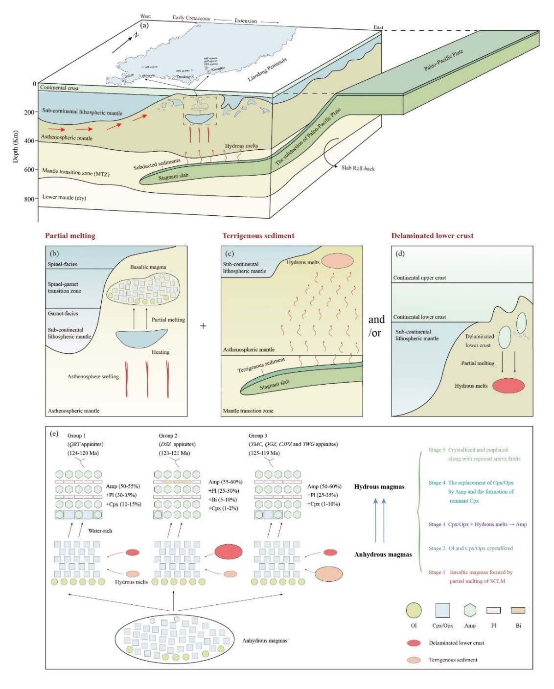 水作为地球深部的重要挥发分,在岩浆形成、运移和冷凝过程中扮演着关键角色。角闪石是大陆岩石圈地幔中最常见的含水矿物之一。富闪侵入岩因发育高含量(多数≥50 vol.%)的角闪石,通常是富水的玄武质岩浆冷凝结晶的天然样例,同时因其具有基性岩浆的地球化学属性,也是富水岩石圈地幔部分熔融的典型产物之一。富闪侵入岩的成因如何?它们反映的岩石圈地幔深部过程如何?这些问题并没有得到很好的解决。