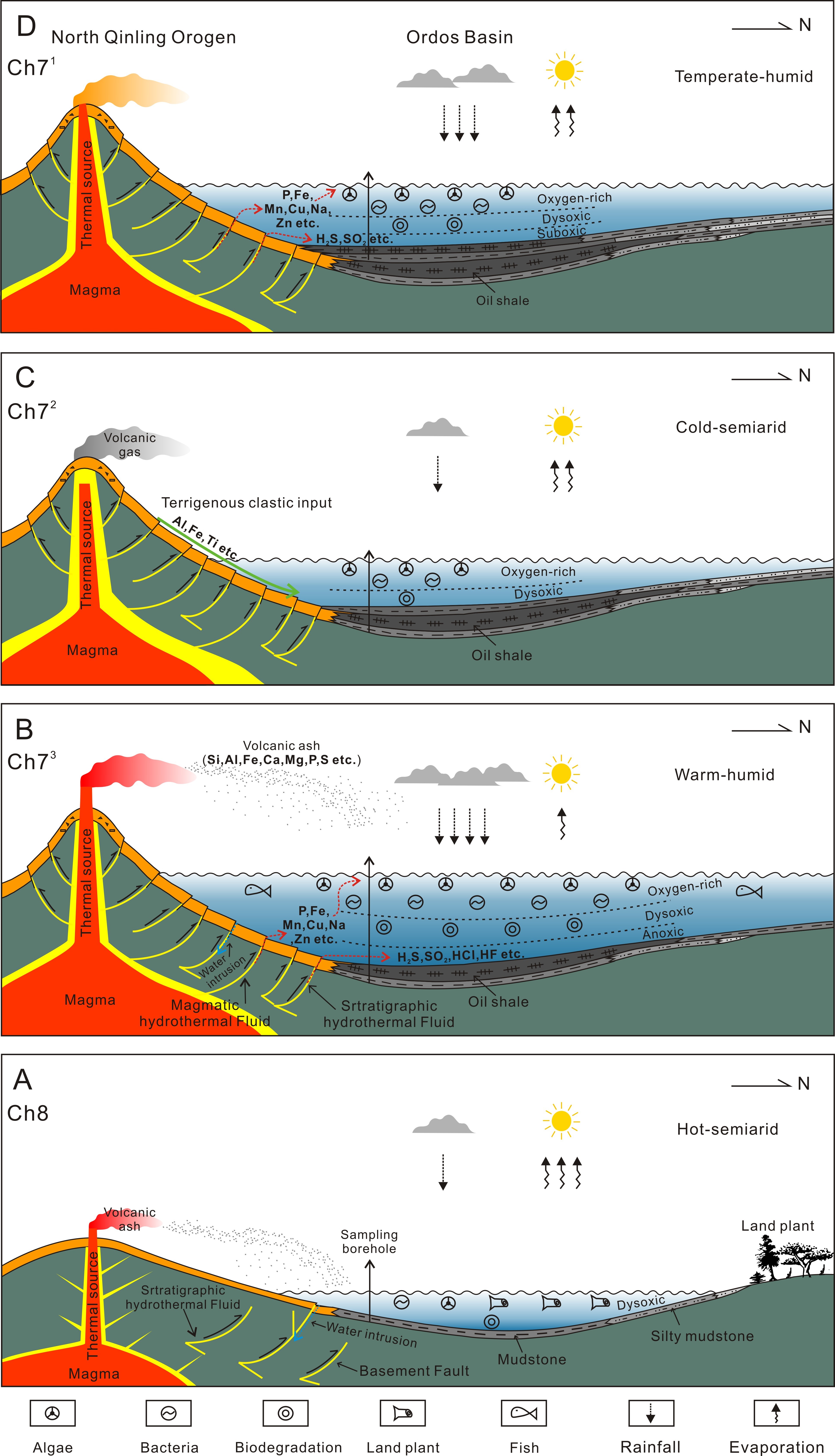 油页岩是一种有机质异常富集的细粒沉积岩,在含油页岩的沉积组合序列中,高含油率油页岩发育经常与大洋缺氧、火山作用、热液活动、海侵作用等事件沉积伴生,同时,地质事件往往在有机质富集过程中起到了重要作用,与页岩油气等非常规油气资源存在着密切联系,近年来受到了广泛关注。事件性沉积往往可以打破湖泊原有生态系统的平衡,直接对水体盐度、酸碱性、氧化还原性等沉积条件产生的相应的作用的同时也间接得对湖泊藻类、浮游生物及细菌等湖泊初级生产力造成影响。大多学者对湖泊沉积有机质的研究主要集中于古构造、古气候、古湖泊水体等正常沉积方面,往往忽略事件性沉积(如:火山活动、湿润气候、热液、重力流等自然因素)在有机质聚集过程中的作用。