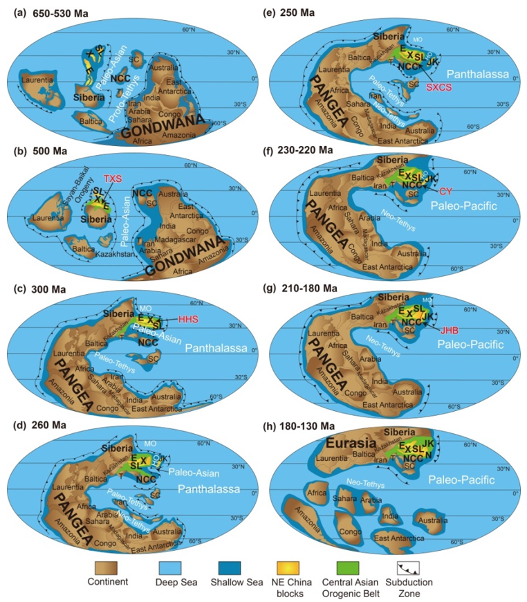 (1)古亚洲洋构造域(500–250 Ma):晚寒武世(~500 Ma),头道桥–新林缝合带闭合,额尔古纳地块与兴安地块拼合,代表了古亚洲洋构造域在中国东北演化的第一阶段(图3a–3b)。晚石炭世(~300 Ma),贺根山–黑河缝合带就位,额尔古纳–兴安地块与松辽地块拼合,代表了古亚洲洋构造域在中国东北演化的第二阶段(图3c)。二叠纪末(~250 Ma),索伦–西拉木伦–长春缝合带就位,额尔古纳–兴安–松辽地块与华北克拉通拼合,古亚洲洋闭合,代表了古亚洲洋构造域在中国东北演化的第三阶段(图3d–3e)。