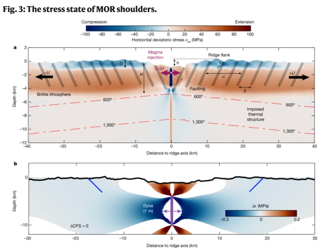 为了检验离散板块边界发生构造缩短在动力学可行性,作者们进一步开展了二维的地球动力学数值模拟研究。模拟的结果显示,对于一个具有中央裂谷的对称型洋中脊,新生洋壳在中央裂谷内发生挠曲(Bending),这种挠曲作用会随着新生洋壳从裂谷中心离轴出来的时候释放(unbending),从而产生S一个水平压缩区域(图3.a),在这个区域内,水平偏应力超过~10MPa,达到压缩莫尔-库伦破裂阈值,应力峰值位于离轴约15 公里处,与发生逆冲地震的空间位置重叠。