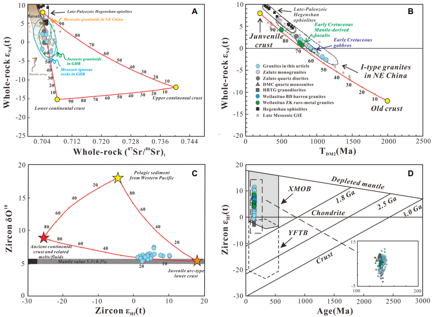 高分异花岗岩作为大陆地壳成熟度的标志,其源区和成因蕴含着探索大陆地壳生长、岩石圈演化及区域构造发展等重要信息,此外,高分异花岗岩具有成矿专属性,往往与稀有金属矿产密切相关。然而,控制花岗岩高度分异和稀有金属矿化的机制尚不清楚。针对以上问题,太阳集团tyc151葛文春教授科研团队选取大兴安岭南段早白垩世贫矿高分异花岗岩开展锆石微量和U-Pb-O-Hf同位素、全岩主微量和Sr-Nd-Pb同位素的分析测试(图1),并与周围同期花岗岩堆晶体和稀有金属花岗岩进行综合对比,揭示了高分异花岗质岩浆形成和演化的过程,并探讨了影响高分异花岗岩稀有金属矿化的关键因素。具体研究成果如下: