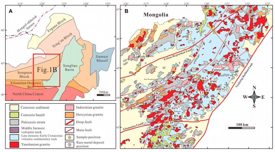 图1(A)中国东北构造简图;(B)大兴安岭南段地质图。五角星代表取样位置