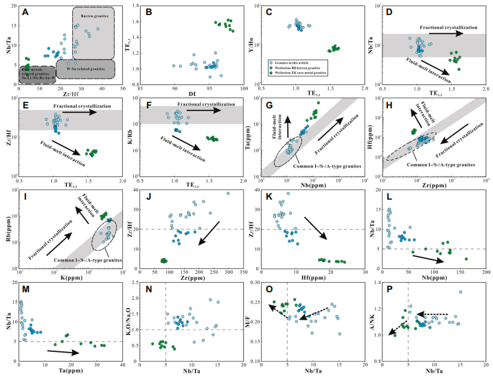 3. 探讨了控制高分异花岗岩稀有金属矿化的机制。与研究区花岗岩相比,维拉斯托稀有金属花岗岩具有更高的DI以及更低的双胞胎元素比值(Zr/Hf、Nb/Ta、Y/Ho、K/Rb),进一步证明强烈的高度分异作用是控制大兴安岭南段稀有金属成矿的关键因素(图5)。而双胞胎元素比值和TE1,3值之间的负相关性指示维拉斯托稀有金属花岗岩相比于贫矿高分异花岗岩经历了强烈的熔流体相互作用(图5)。因此,I型花岗质岩浆稀有金属矿化可能是高分异程度和强熔流体相互作用相耦合的结果。