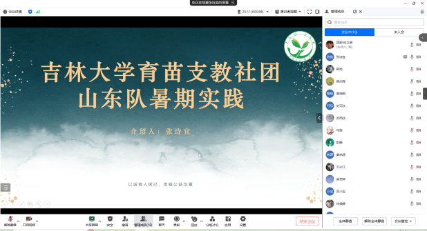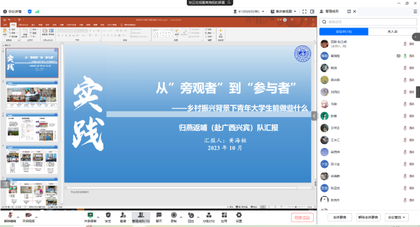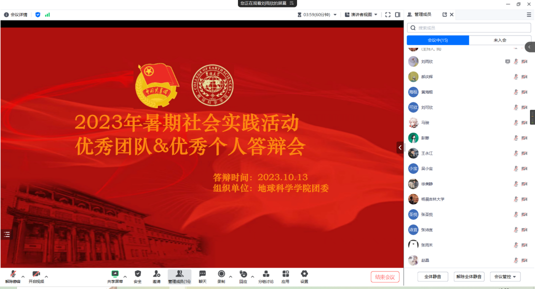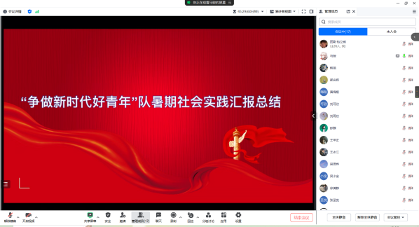 2023年10月14日晚上七点,2023年暑期社会实践评比大会顺利召开。本次会议采用线上腾讯会议的形式举行,出席会议的有太阳集团tyc151公司团委书记兼2021级辅导员韩旭老师、2022级辅导员赵晶老师、公司第二十三届员工组织主要负责人以及参评同学参会。