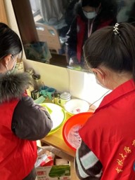 打扫组志愿者在护工人员的指导下,帮助老人整理床铺、更换被褥、打扫卫生,并为病人提供清洁服务,如修剪指甲、梳头等,确保老人们生活在一个干净舒适的环境中。最后,在完成所有活动后,志愿者们与老人们一起包饺子、煮饺子,共享了一顿温暖的晚餐。