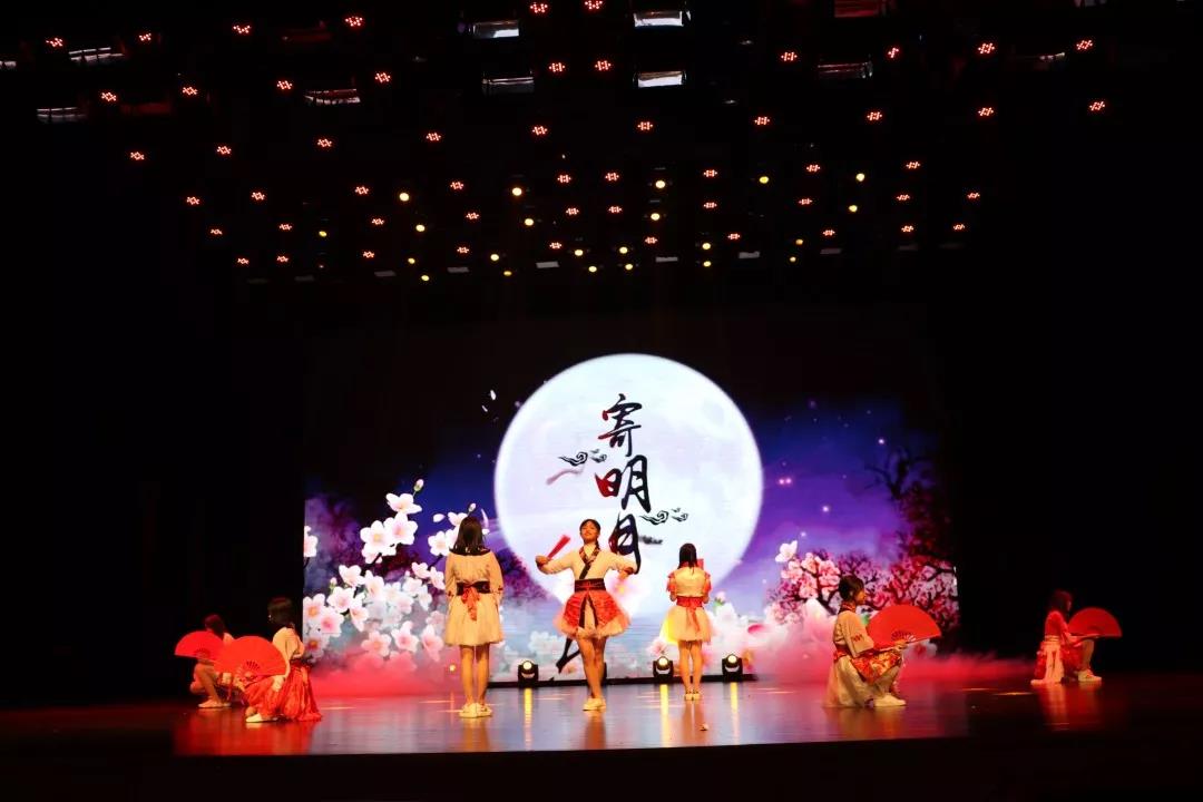 红色的折扇,鲜艳的服装,我们看到的是由谷静雯、袁巧巧等同学带来的舞蹈《寄明月》。经过一次又一次的努力排练,同学们的舞蹈非常精彩,每一个动作都展现了古典美人的韵味。