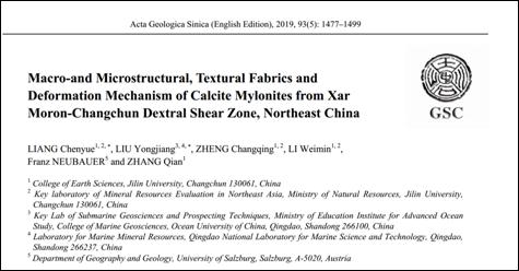 以上研究成果发表在Acta Geologica Sinica - English Edition上(Liang, C.Y., Liu, Y.J., Zheng, C.Q., Li, W.M., Neubauer, F., & Zhang, Q. (2019). Macro-and Microstructural, Textural Fabrics and Deformation Mechanism of Calcite Mylonites from Xar Moron-Changchun Dextral Shear Zone, Northeast China. Acta Geologica Sinica - English Edition, 93(5), 1477-1499. doi:10.1111/1755-6724.14357)